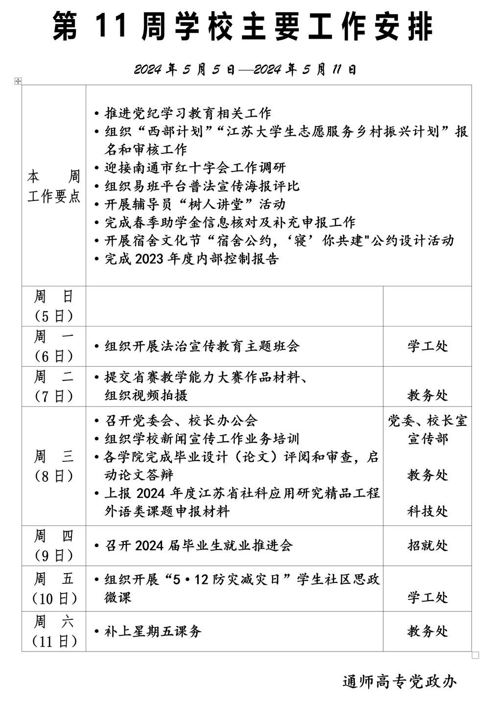 2023-2024学年第二学期第11周多盈体育(中国)主要工作安排
