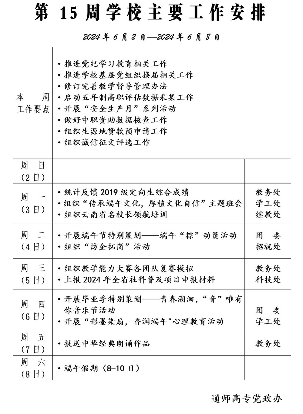 2023-2024学年第二学期第15周多盈体育(中国)主要工作安排