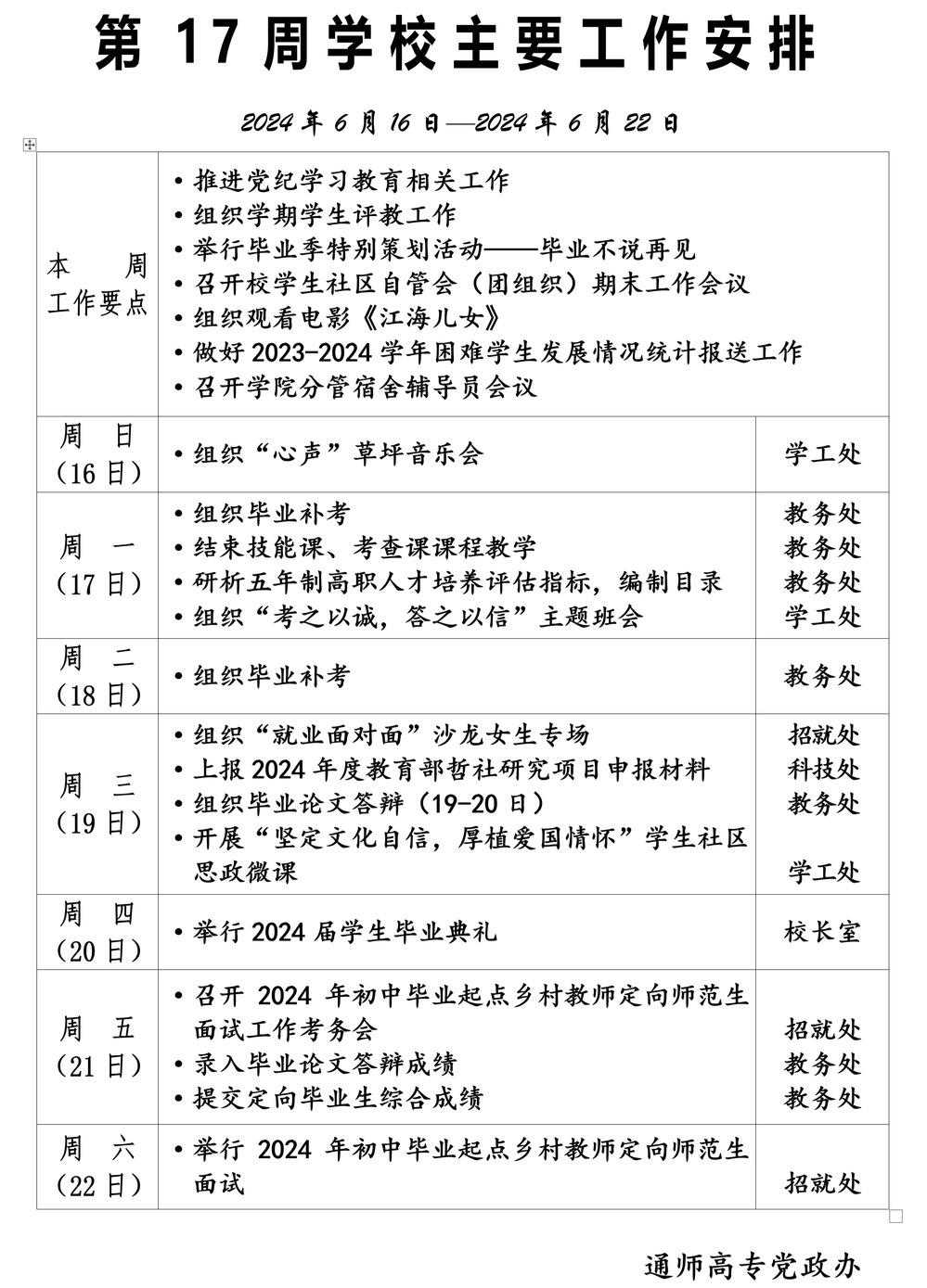 2023-2024学年第二学期第17周多盈体育(中国)主要工作安排