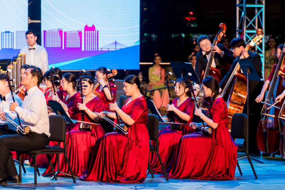 演出在民乐合奏《庆典序曲》中拉开帷幕,序曲热烈欢腾,点燃了观众的热情。音乐舞蹈学院黄忠院长亲自担任指挥。由他率领的这支南通市青年民族管弦乐团由通师高专师生组成,曾在各级各类赛事上屡获殊荣,为大家带来了殿堂级的视听享受,彰显了百年师范的音乐根基。