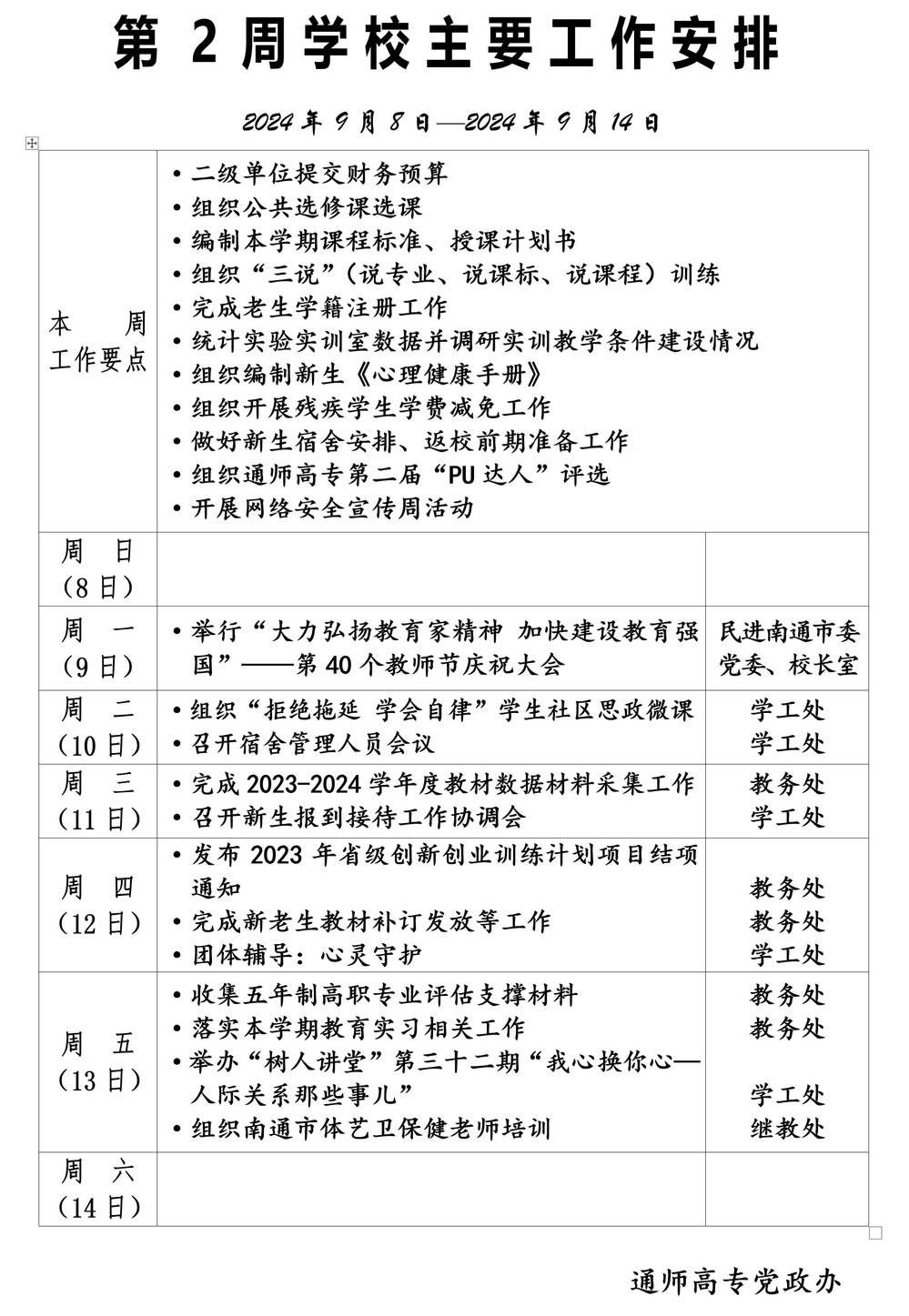 2024-2025学年第一学期第2周多盈体育(中国)主要工作安排