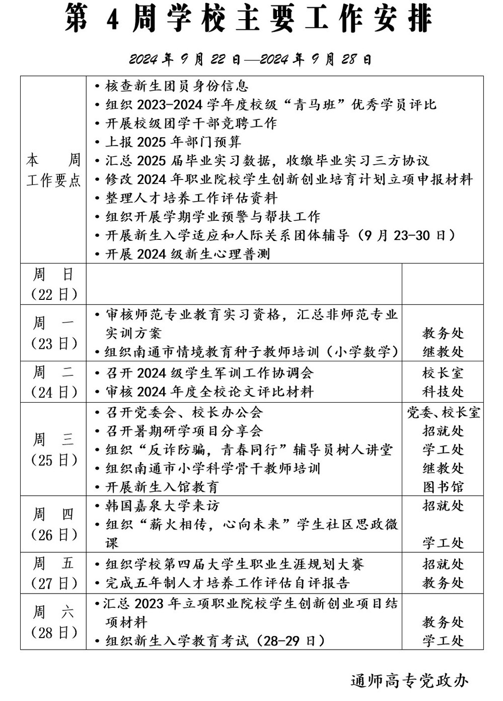 2024-2025学年第一学期第4周多盈体育(中国)主要工作安排