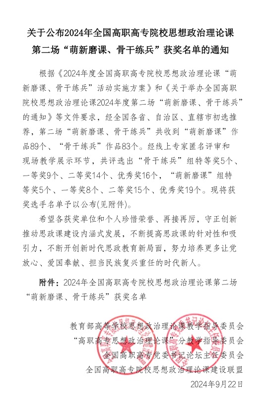 多盈体育马克思主义学院张严文老师,在2024年全国高职高专院校思想政治理论课第二场“萌新磨课、骨干练兵”教学展示中荣获“萌新磨课”组特等奖。