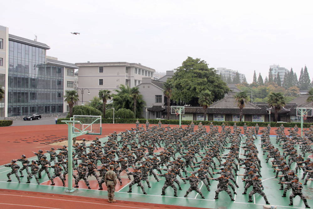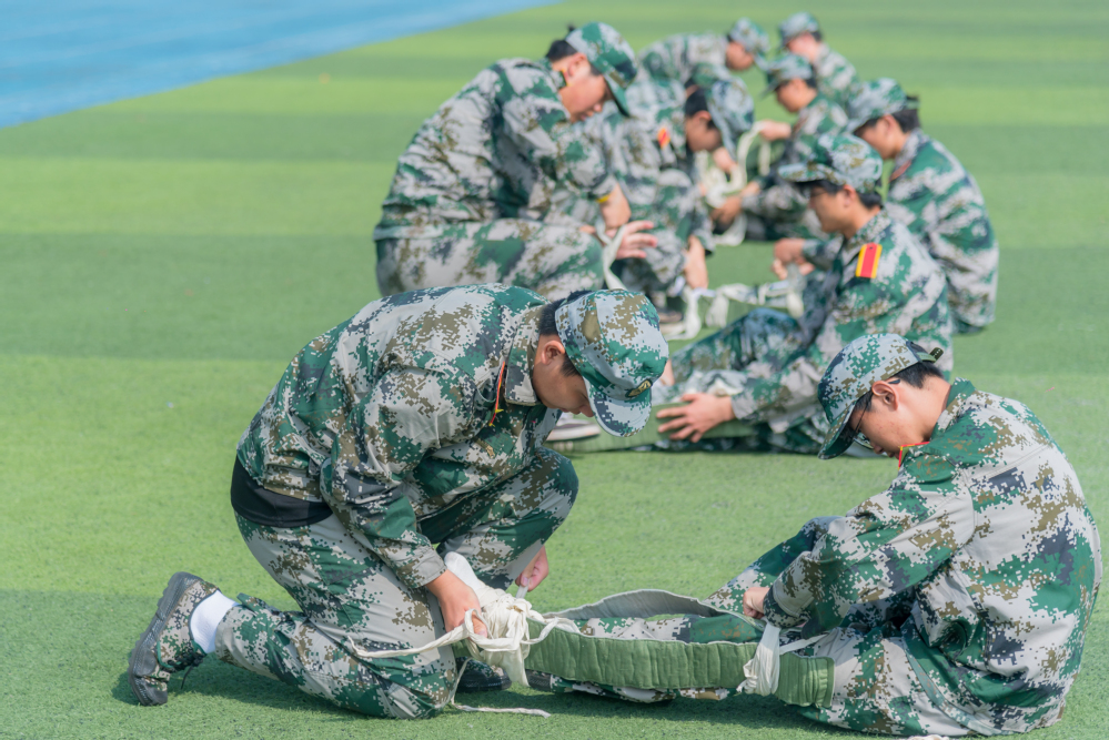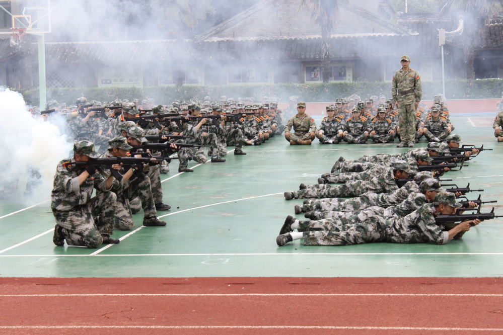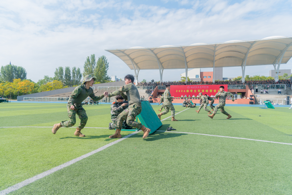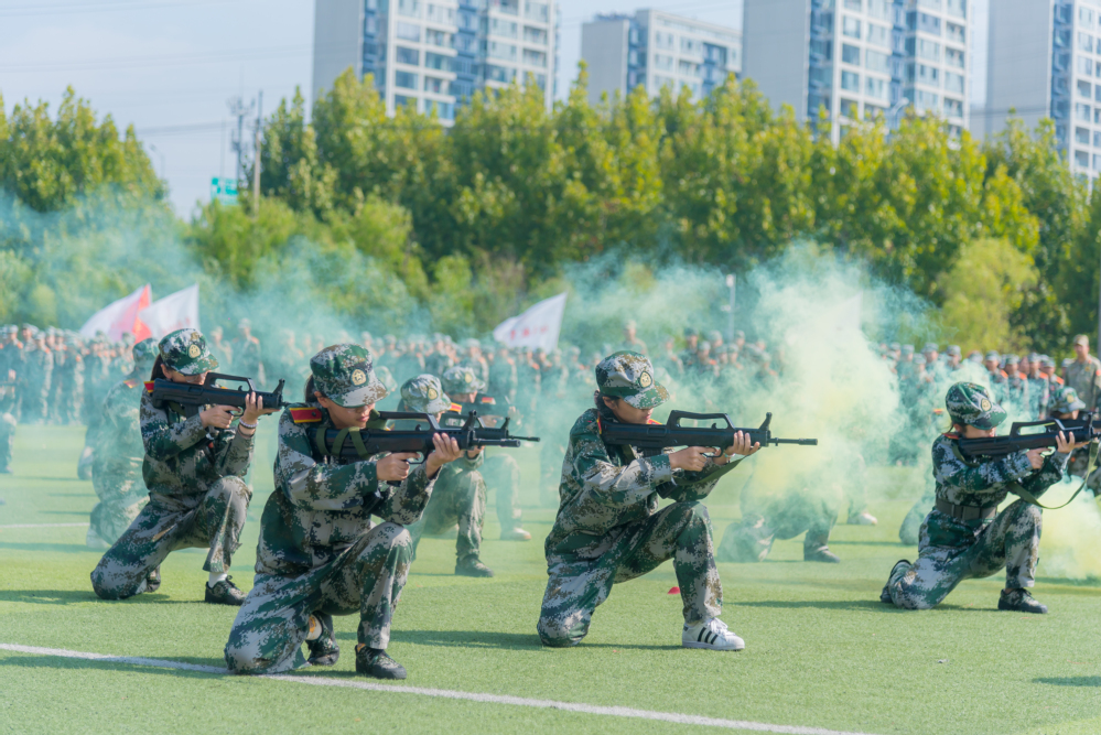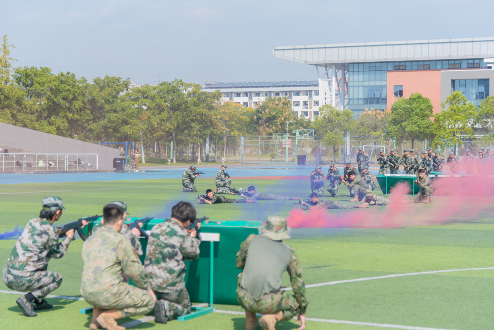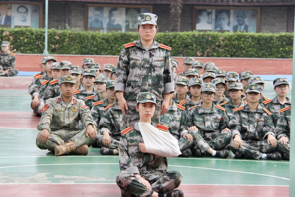 军训队员还进行了队列、女子匕首操、卫生救护、棍术、拳术、战术综合演练表演。