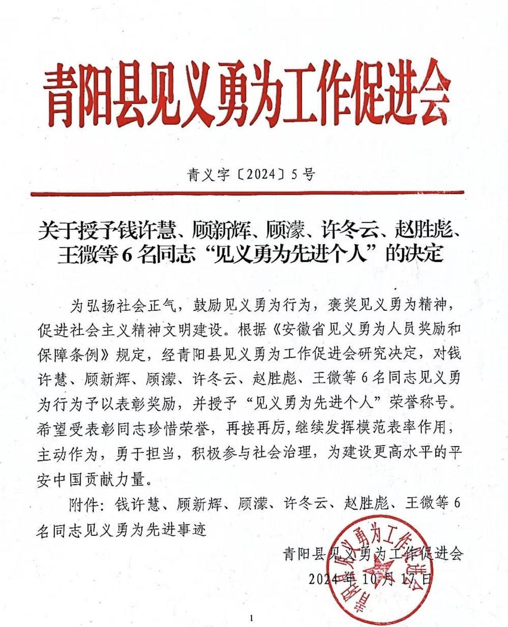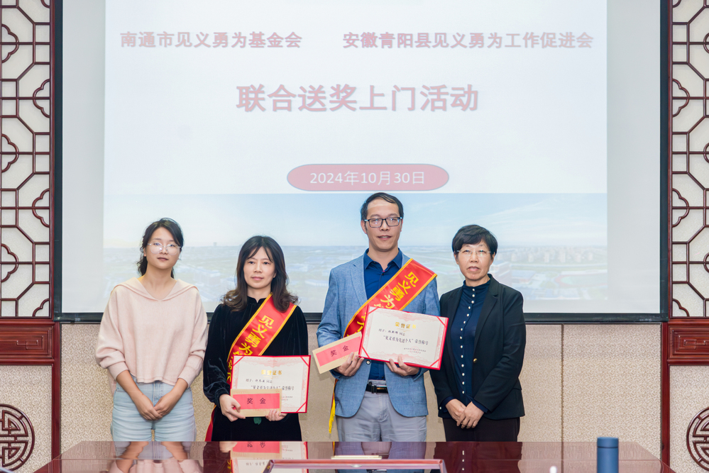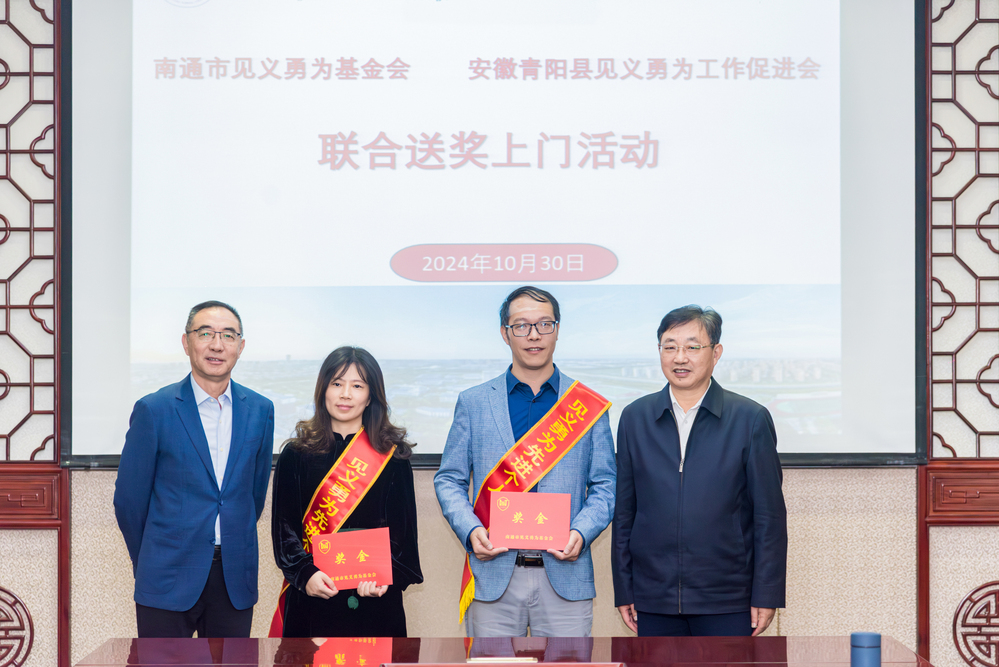 随后,南通市见义勇为基金会联合青阳县见义勇为工作促进会一同为顾新辉、许冬云同志颁奖。
