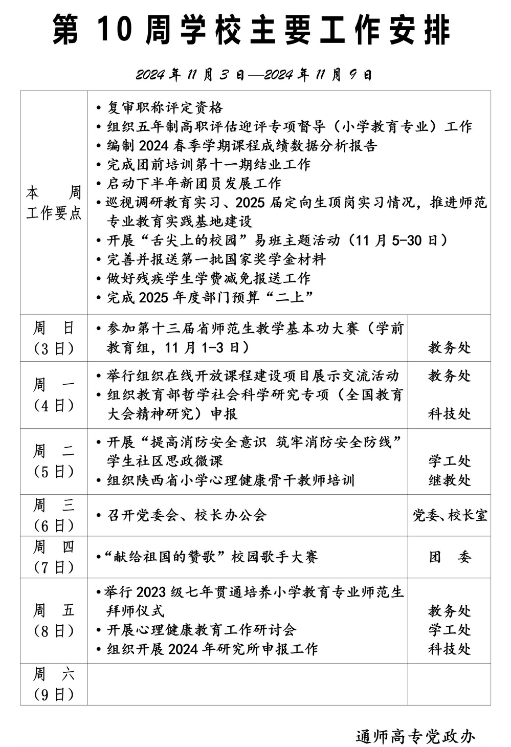 2024-2025学年第一学期第10周多盈体育(中国)主要工作安排