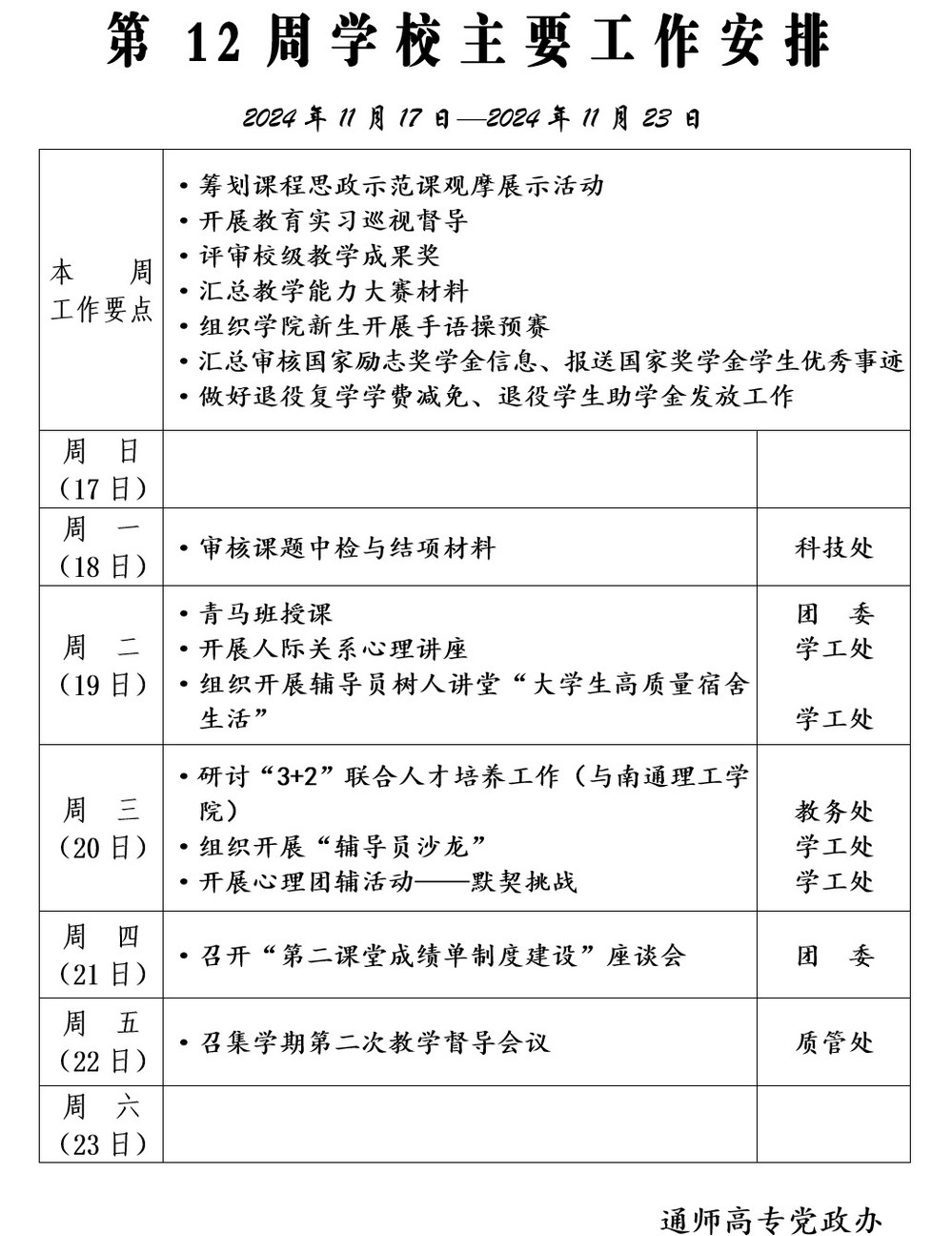 2024-2025学年第一学期第12周多盈体育(中国)主要工作安排