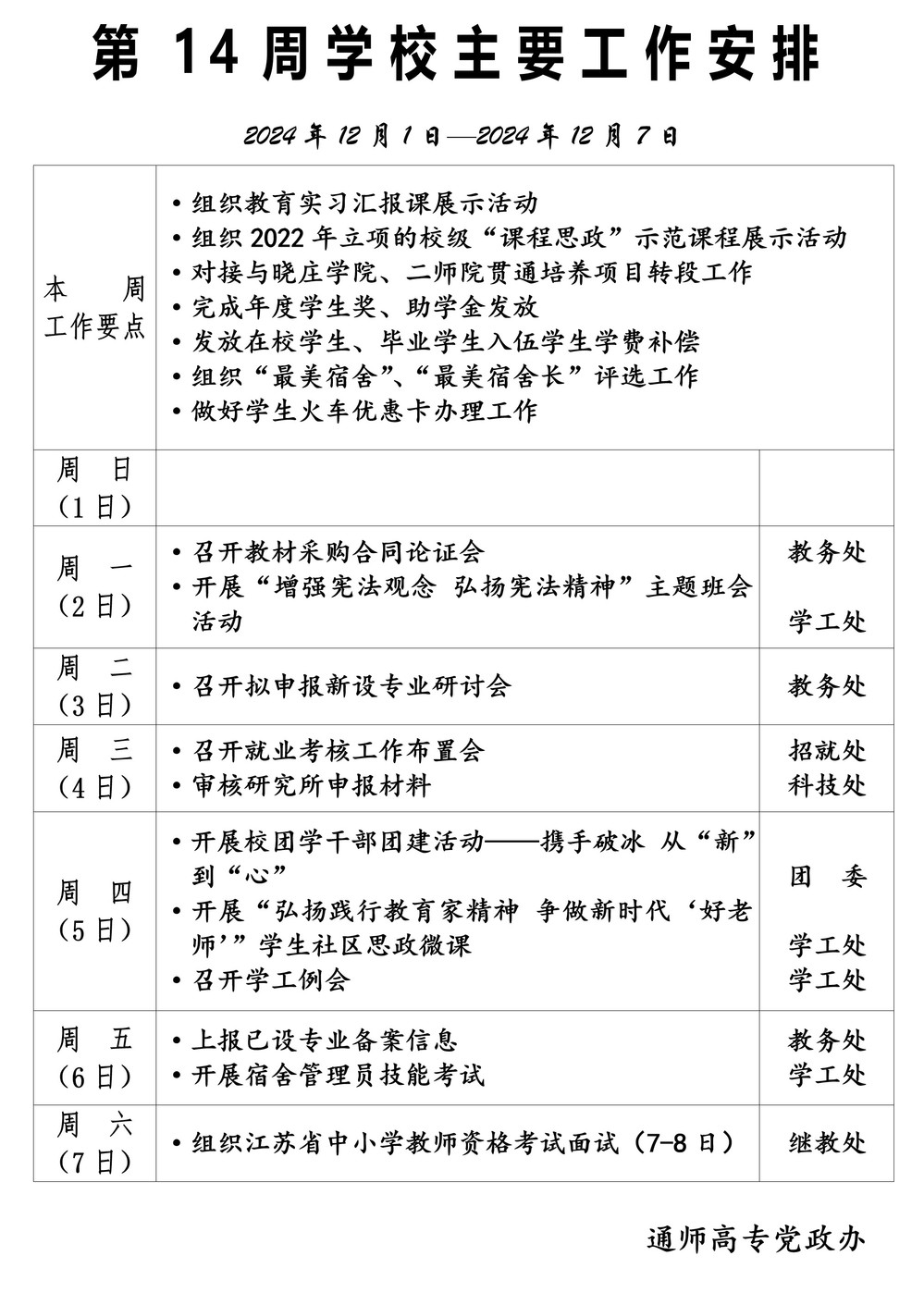 2024-2025学年第一学期第14周多盈体育(中国)主要工作安排