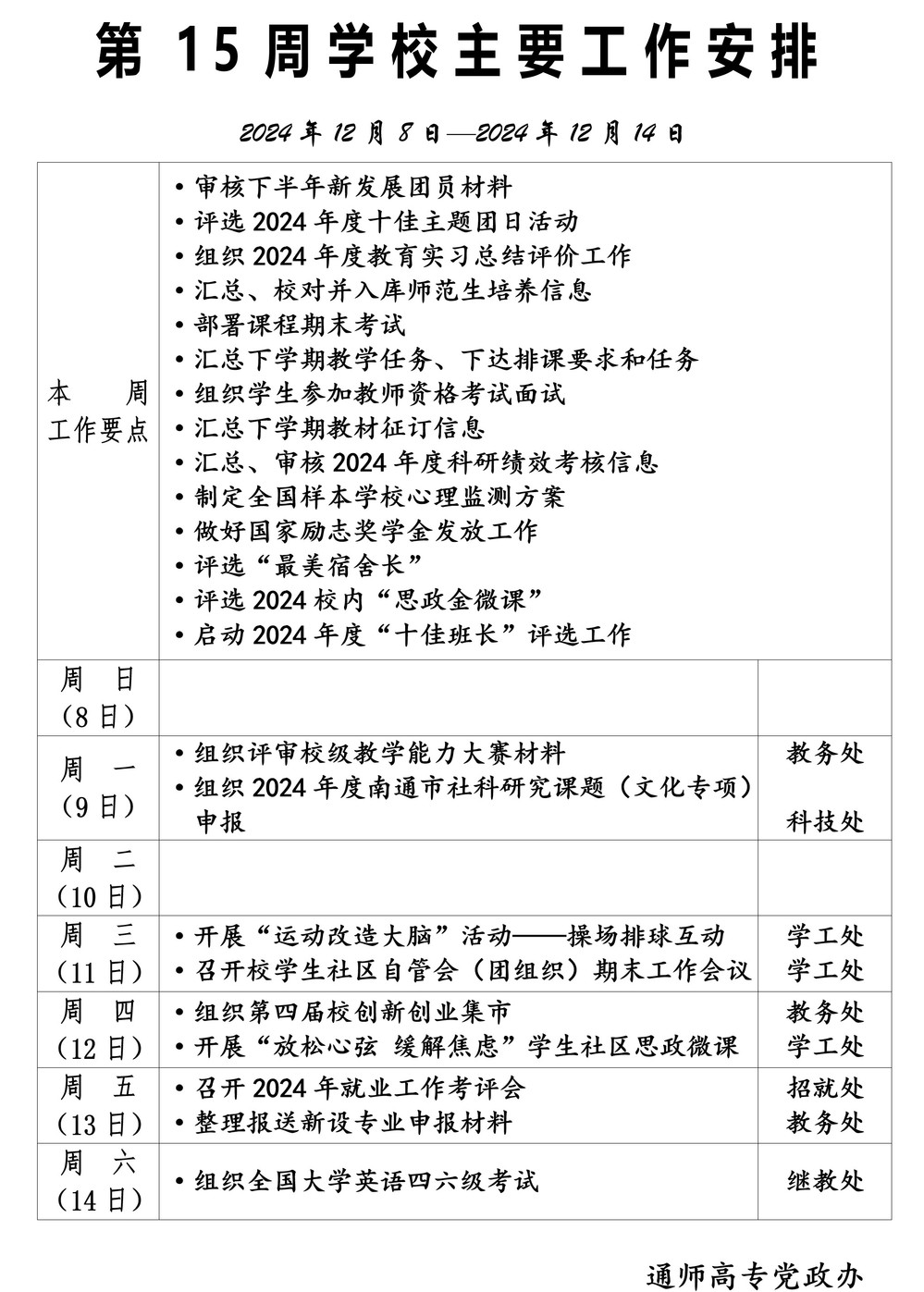 2024-2025学年第一学期第15周多盈体育(中国)主要工作安排