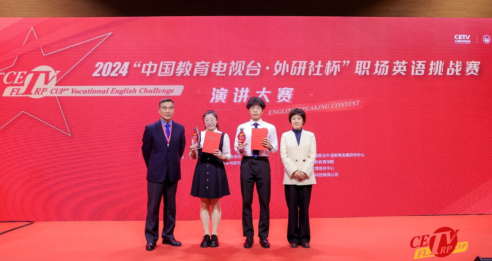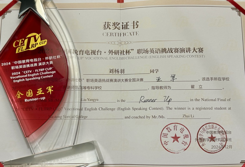 12月17日,2024“中国教育电视台·外研社杯”职场英语挑战赛演讲大赛全国总决赛在北京圆满落幕。多盈体育初等教育学院小学教育21(3)班刘杨羽同学(下图左二)与来自全国各高职院校的98名晋级选手同台竞技,最终获得全国总决赛特等奖,翟立老师获优秀指导老师奖。