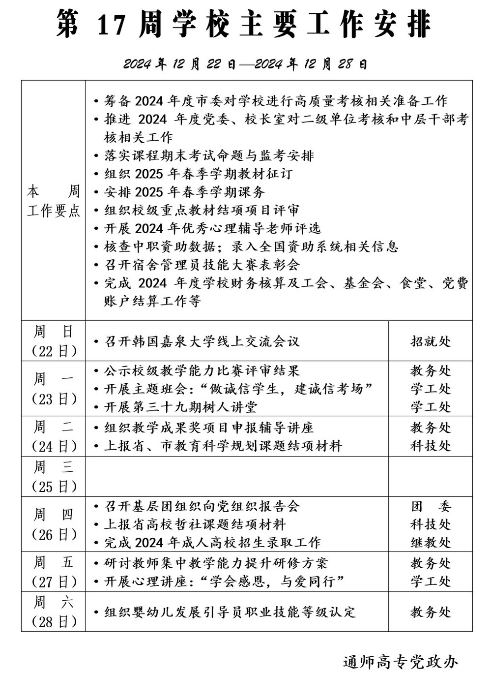 2024-2025学年第一学期第17周多盈体育(中国)主要工作安排
