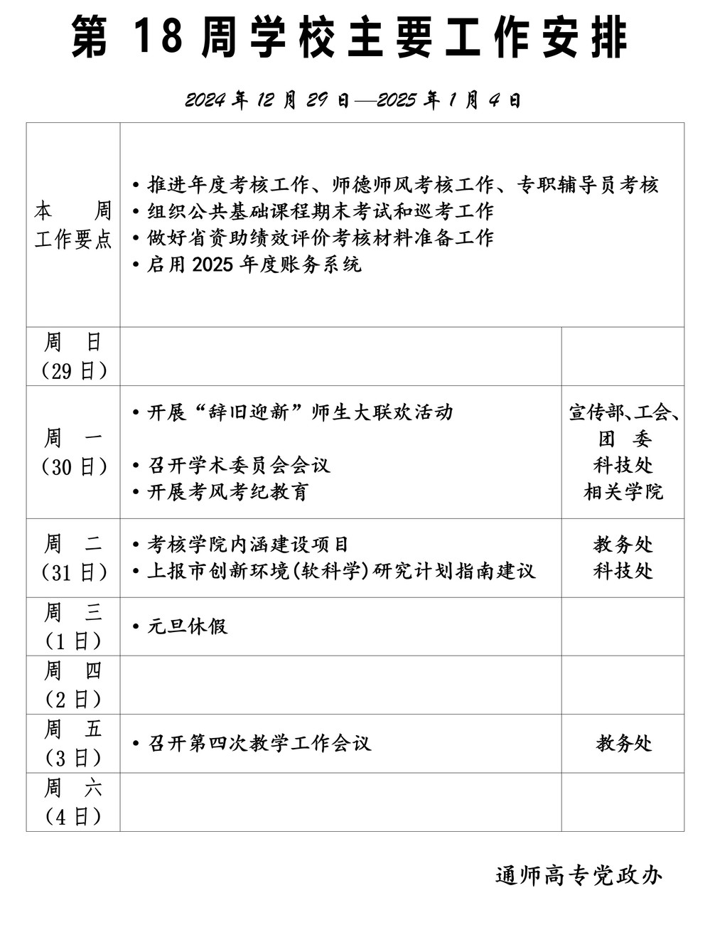 2024-2025学年第一学期第18周多盈体育(中国)主要工作安排