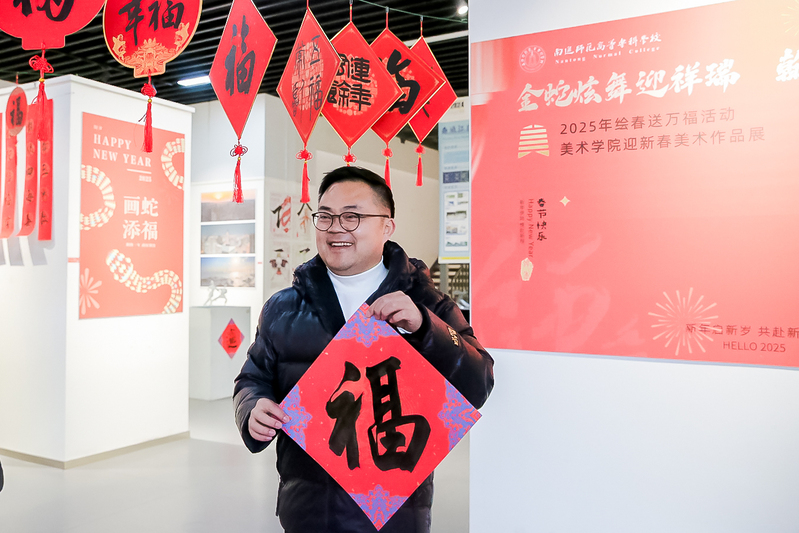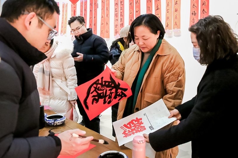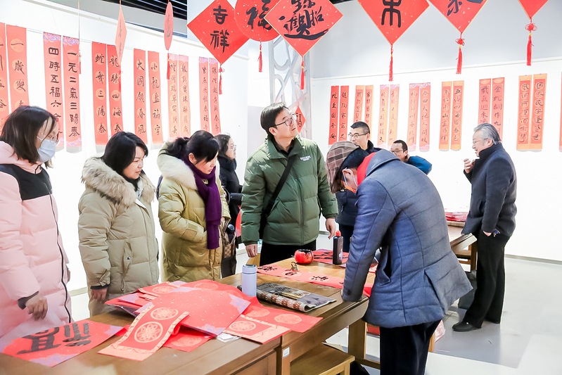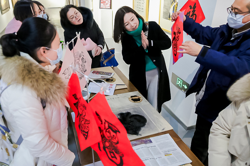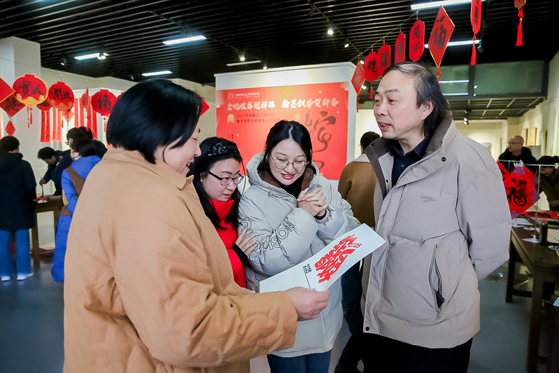 老师们在接“福”间隙,纷纷踏入美术馆深处,驻足在年俗文化作品前,细细品味着画中的意境与情感。这场展览不仅丰富了老师们的精神文化生活,也进一步增强了美院的凝聚力和向心力,为即将到来的新年增添了浓厚的文化氛围和喜庆色彩。