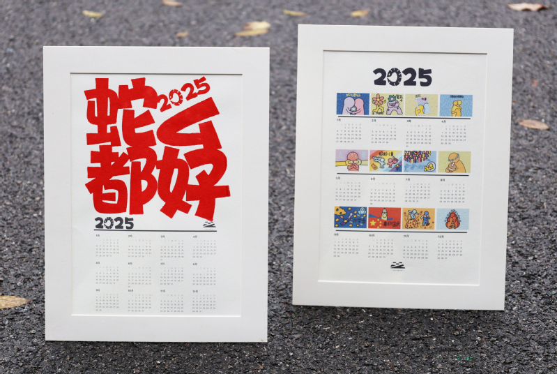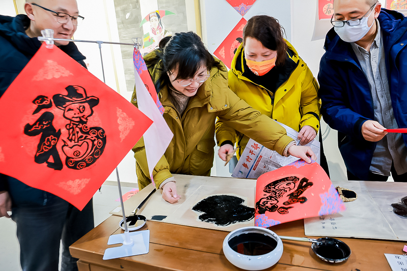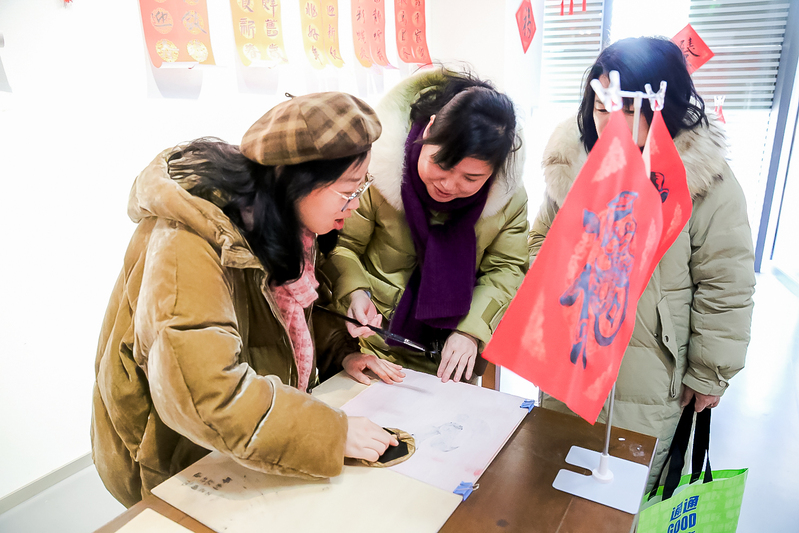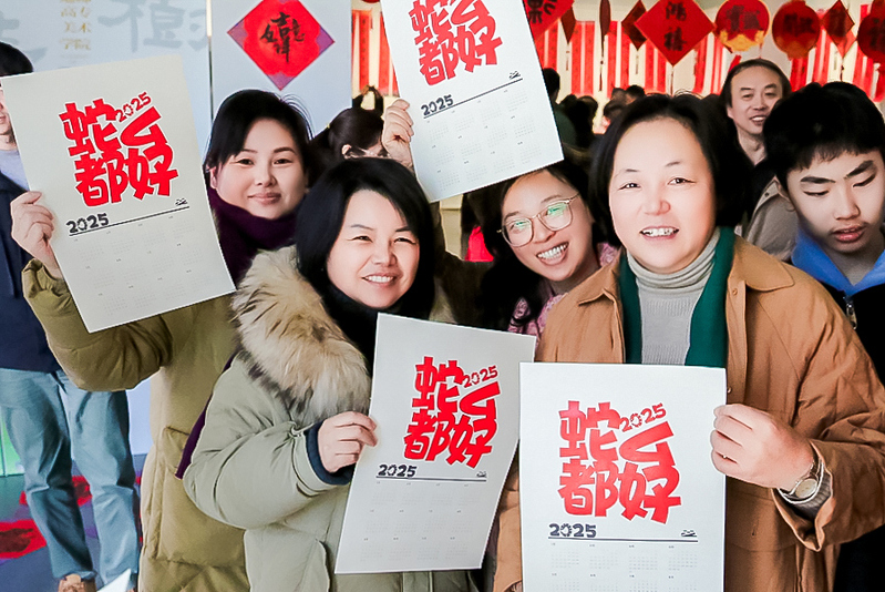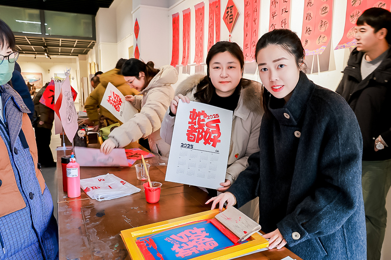 除了以传统方式书写福字,在实践活动区还可以自己DIY印制创意卡通“福”字、“蛇么都好”2025年年历,这一创新环节极大地激发了大家的参与热情,许多老师纷纷动手尝试,体验了一把传统文化的魅力。从对福、刷福、印福到揭(接)福,每一个步骤都充满了乐趣和期待。有教师在体验过程中边印边唱《新年好》,现场气氛高涨,欢声笑语不断。