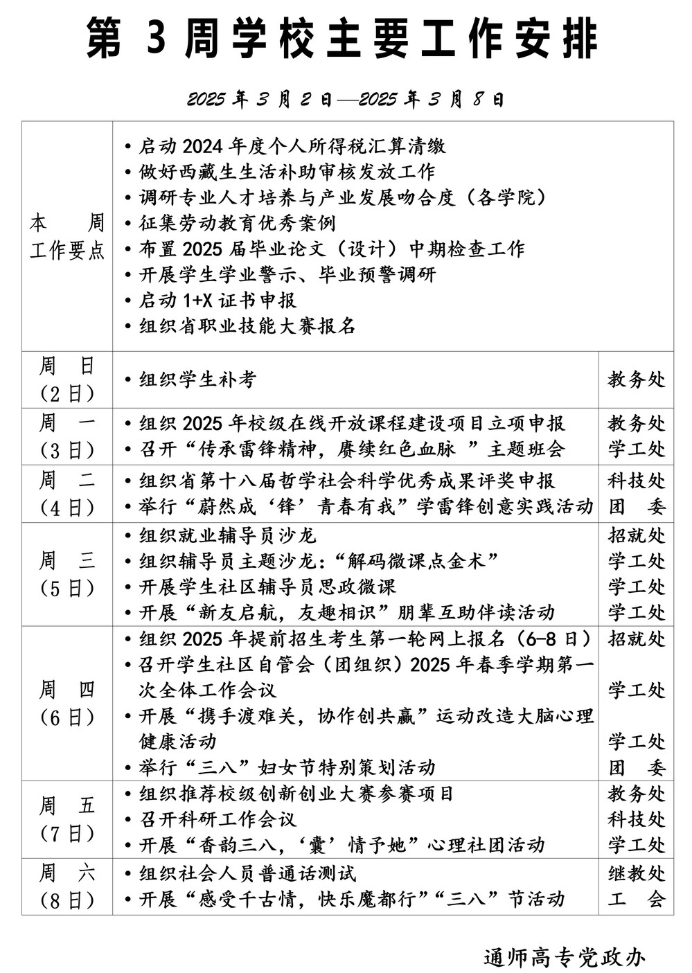 2024-2025学年第二学期第3周多盈体育(中国)主要工作安排