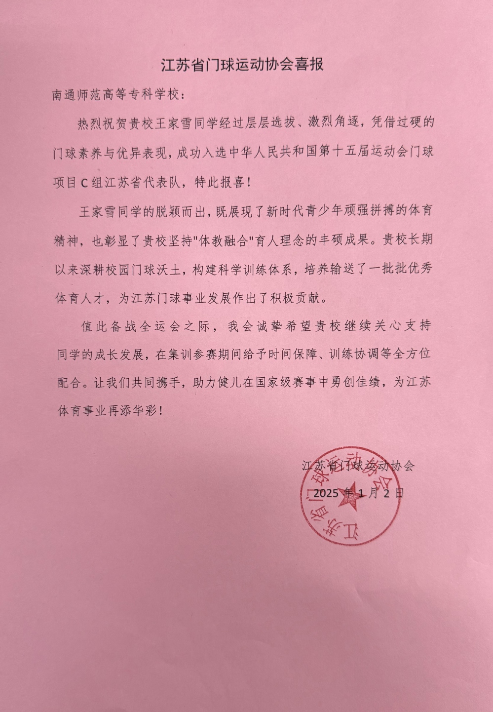 此次入选江苏省门球队,王家雪同学表示倍感荣幸,也深知责任重大。她表示将珍惜这次难得的机会,在接下来的训练中全力以赴,不断提升自身水平,力争在全运会上为江苏省争光添彩。让我们共同期待她在第十五届全运会上的精彩表现!