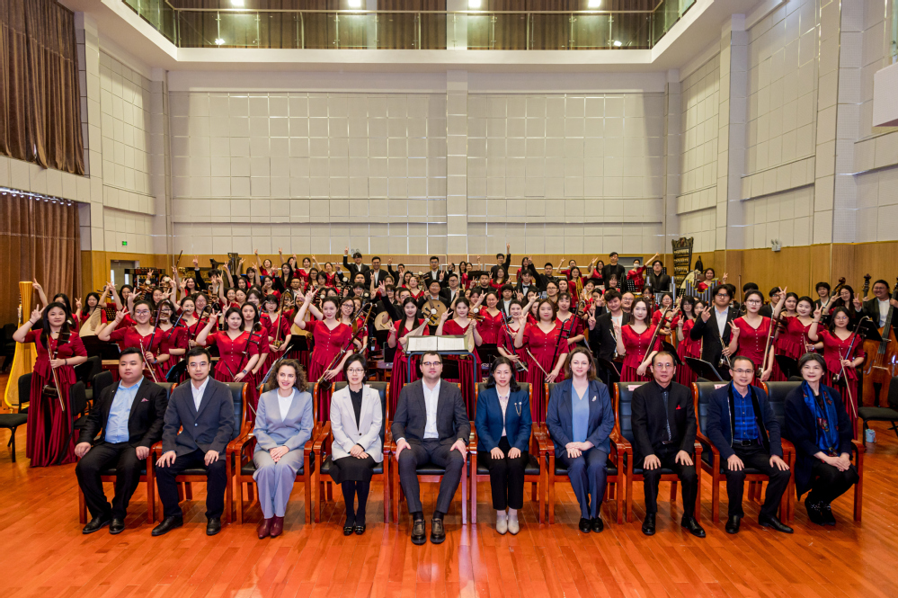 仪式结束后,访问团观看了民乐团排练。舞台上,乐团团员们全情投入,弓弦之间流淌出的美妙音符,交织成一曲曲动人的乐章。从气势磅礴的合奏,到细腻婉转的独奏,每一个音符都仿佛在诉说着中国故事,展现着民族音乐的独特韵味。访问团成员沉浸其中,对民乐团精湛的演奏技巧和饱满的艺术表现力由衷地赞叹。