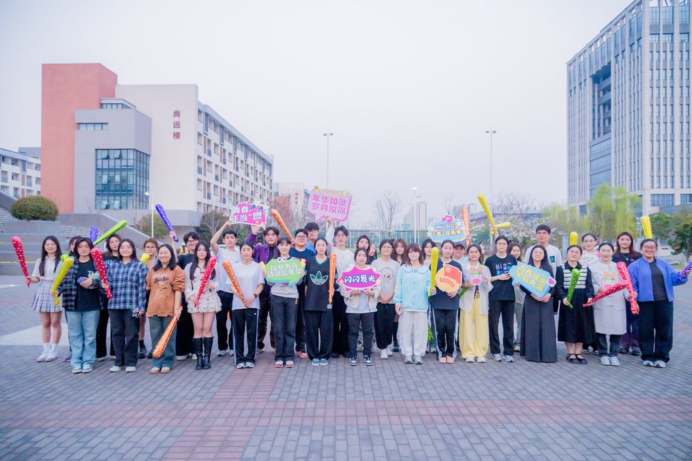 傍晚六时三十分,随着古筝奏响前奏,二十四品弦上淌出星河般的泛音。全体参与者共唱《世界赠予我的》。徐佳莹《最初的记忆》与蔡健雅《达尔文》的旋律片段融入改编,教学楼的灯火渐次点亮,与空中初现的疏星遥相呼应。“你眼中有春秋,胜过我见的山川”的歌声里,现场的师生们纷纷举起相机自拍打卡,寓意将春日美好记录留念。