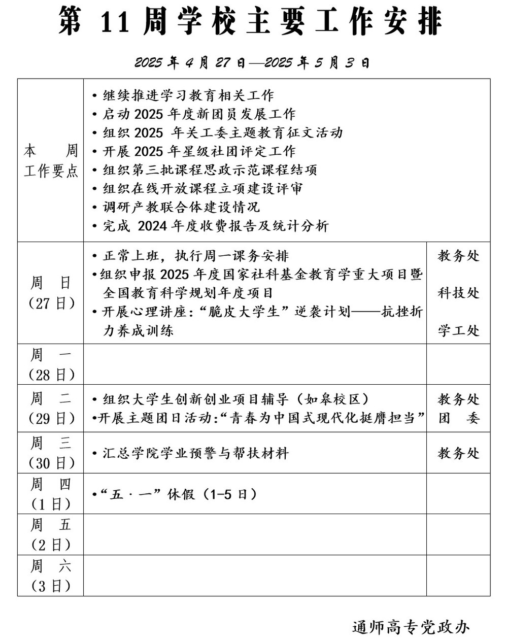 2024-2025学年第二学期第11周多盈体育(中国)主要工作安排