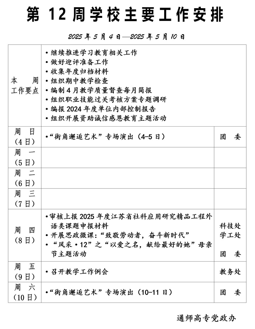 2024-2025学年第二学期第12周多盈体育(中国)主要工作安排