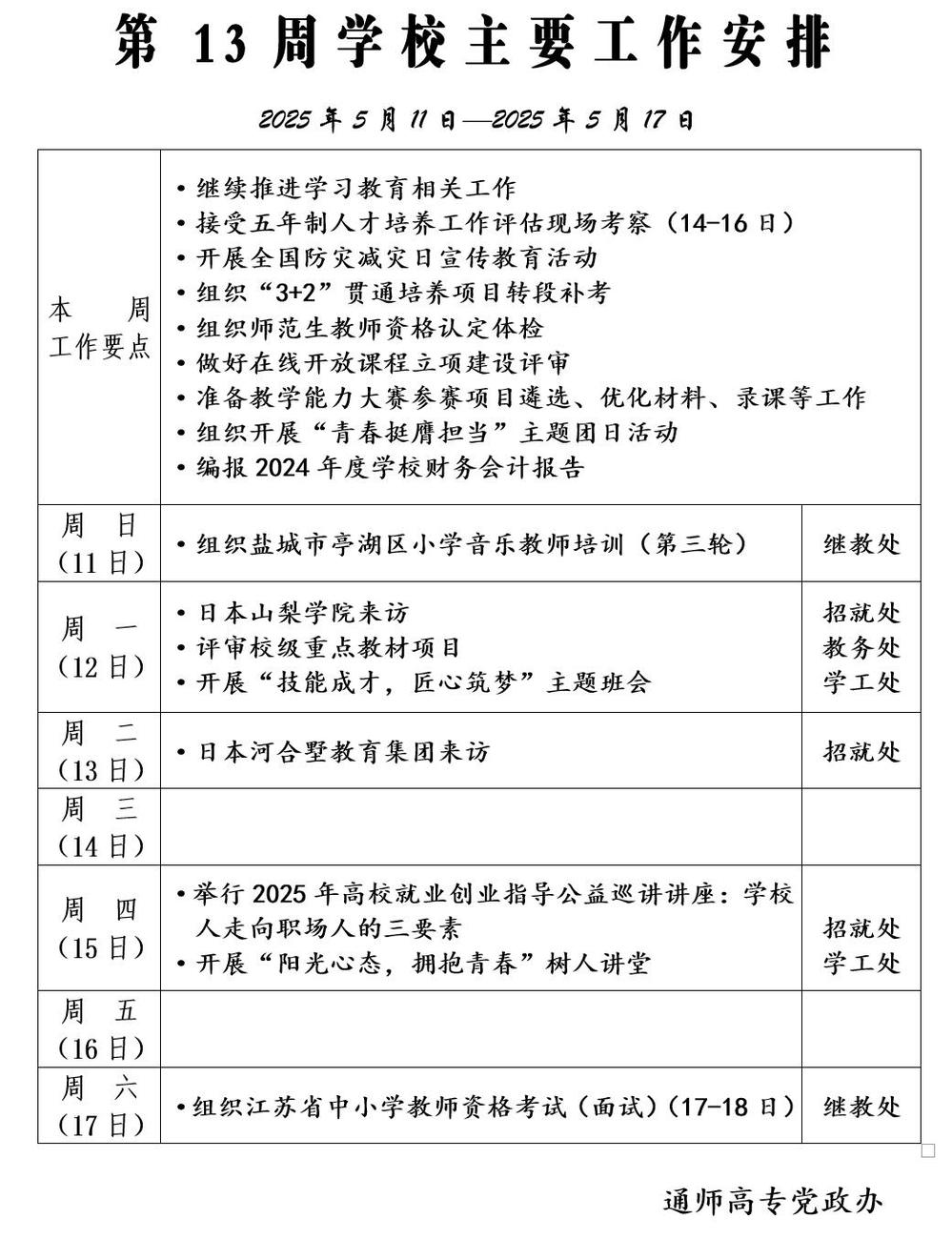 2024-2025学年第二学期第13周多盈体育(中国)主要工作安排
