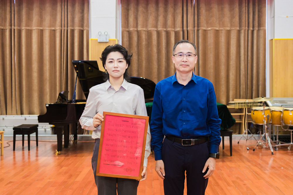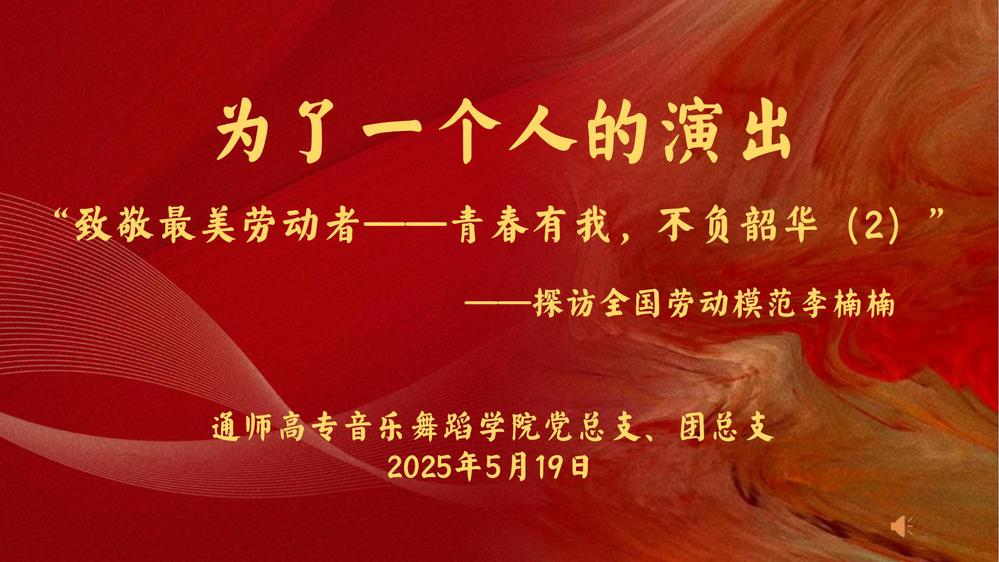 活动中,音乐舞蹈学院师生与最美劳动者李楠楠同志进行了深入的访谈交流,聆听了她的先进事迹。总支全体党员还根据她的先进事迹集体创作了歌曲《最美的榜样》作为礼物赠送给李楠楠同志,表达对她无私奉献精神的崇高敬意,进一步激发了大家热爱劳动、尊重劳动者的热情。最后,李楠楠同志和全体参会人员共同合唱了《稻香》,为本次活动画上了圆满的句号。
