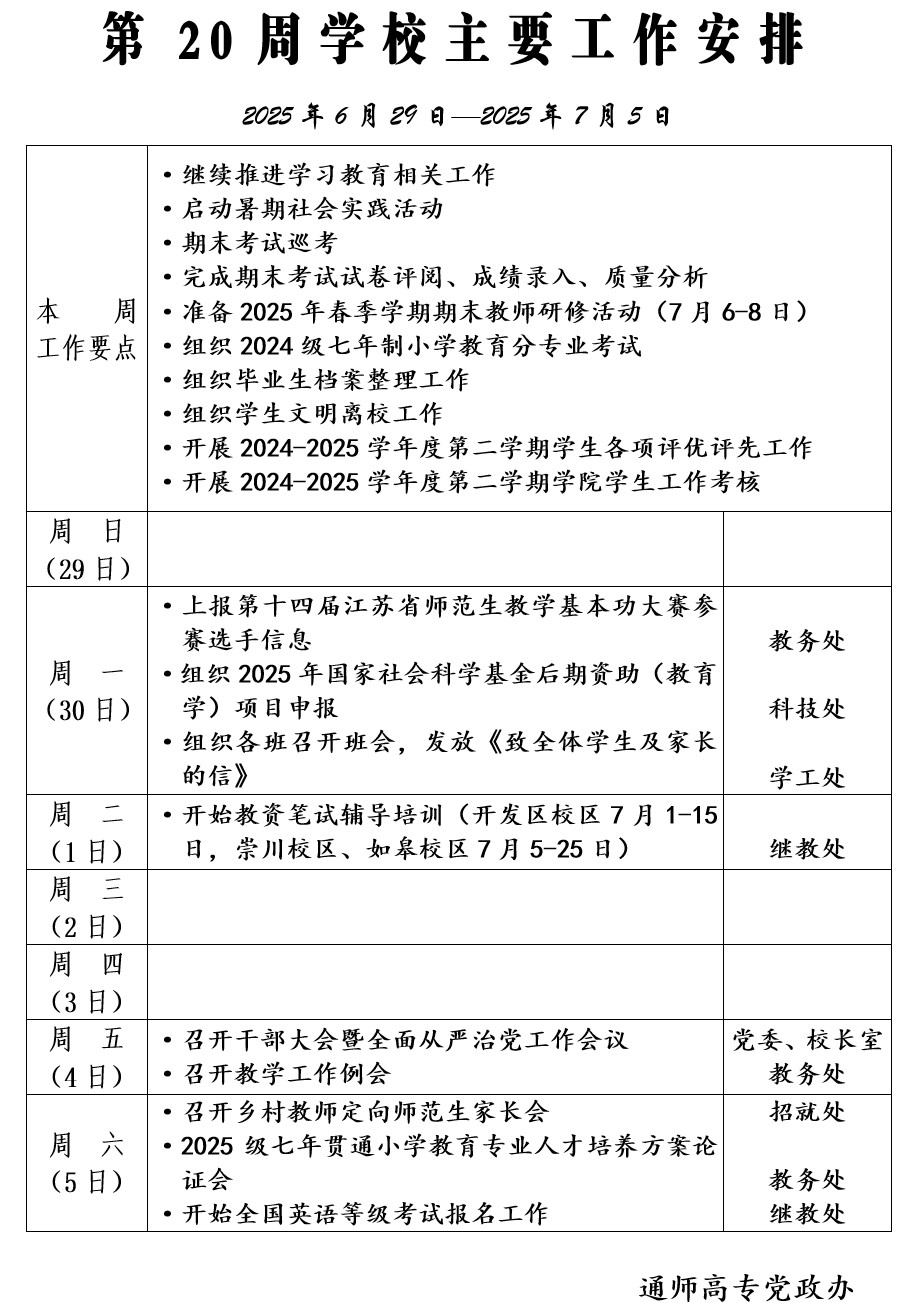 2024-2025学年第二学期第20周多盈体育(中国)主要工作安排
