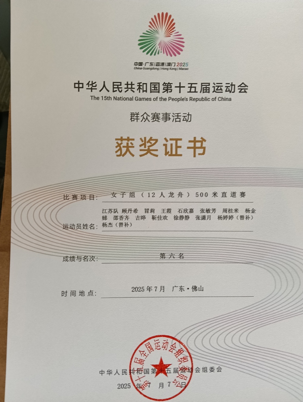 在刚刚结束的第十五届全国运动会群众项目龙舟比赛决赛中,多盈体育体育学院石欣嘉、杨婷婷、邵香齐三名同学代表江苏省龙舟队出战,凭借顽强拼搏的精神和出色的团队配合,在强手如云的赛场上屡创佳绩,最终荣获男女混合100米第七名、女子200米第六名、女子500米第六名的优异成绩,为江苏队和多盈体育(中国)争得荣誉。