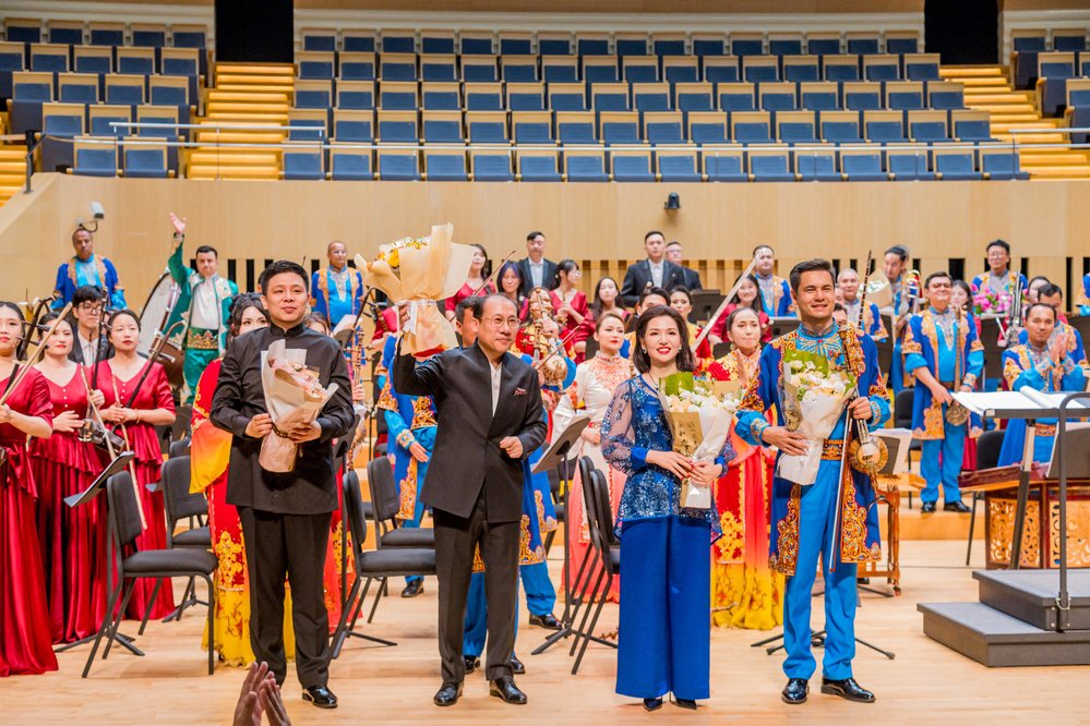 音乐会以天山山脉为叙事主线,通过十个乐章全方位展现新疆风土人情。新疆艺术剧院民族乐团带来都塔尔、艾捷克、热瓦普等十余种特色乐器,在《丝路馨声》《天山麦海》等曲目中,用音符勾勒出戈壁绿洲、草原牧场的辽阔景象。特别是融入世界级非遗“十二木卡姆”元素的《罗布淖尔风情》,通过交响化编配,让古老艺术焕发新生。南通青年民族管弦乐团则以刚柔相济的传统民乐音色与之交相辉映,在《紫罗兰的天空》《星星峡随想曲》等曲目中加入现代作曲技法,形成传统与创新的精彩对话。两大乐团80余名演员同台,使热瓦甫的欢快、萨塔尔的苍凉与传统管弦的柔美交织共鸣。