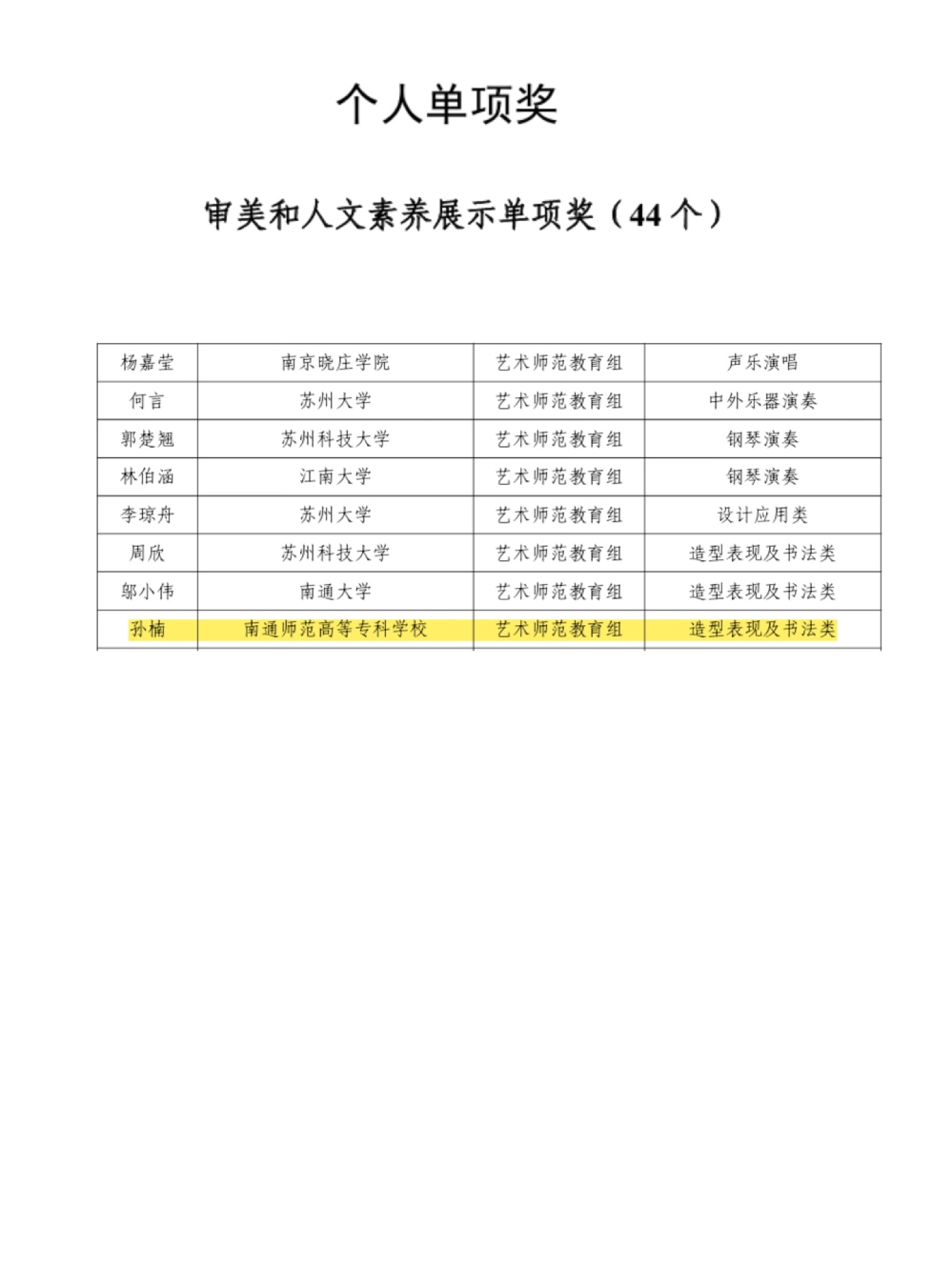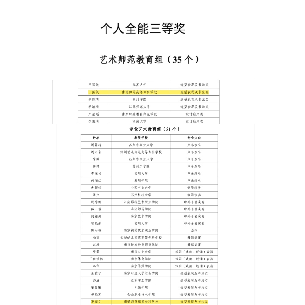 美术学院刘琰老师荣获个人全能一等奖。学前教育第二学院马艺珊老师、音乐舞蹈学院罗茜老师和李梓老师、美术学院孙楠老师荣获个人全能二等奖。美术学院丁国凯老师和罗闻文老师荣获个人全能三等奖。此外,美术学院孙楠老师还荣获了审美和人文素养展示单项奖。