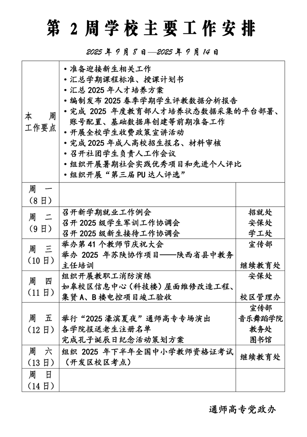 2025-2026学年第一学期第2周多盈体育(中国)主要工作安排